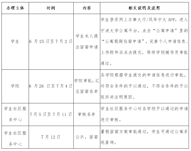 暑假学生住宿申请表》→提交申请。(申请表需由班主任(研究生导师)、辅导员、各学院分管学院工作的负责人签字确认,没有签字视为不同意留宿)。具体工作安排如下表: