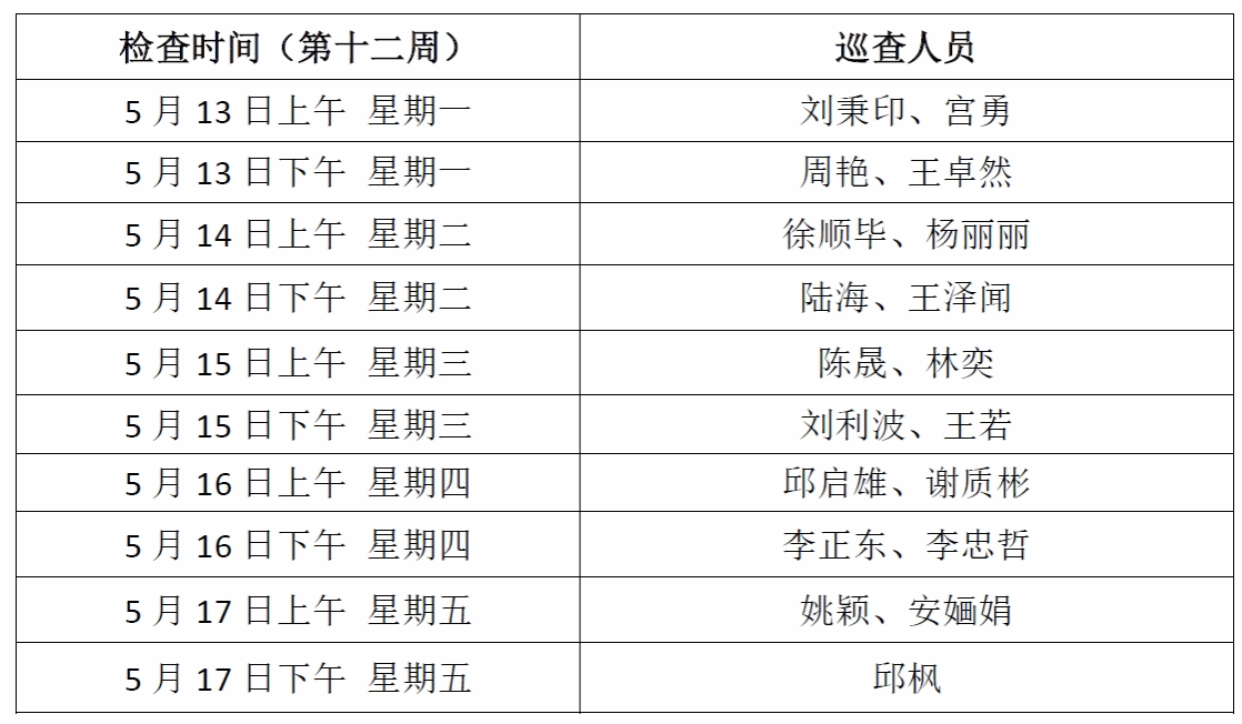 1、检查教师课堂教学基本规范执行情况(包括到课率,迟到、早退情况,上课地点与课表是否相符,课堂纪律情况等),如发现问题,请及时报告给教务办。检查时间:第十一周(5月13日至5月17日)。巡查人员安排表如下: