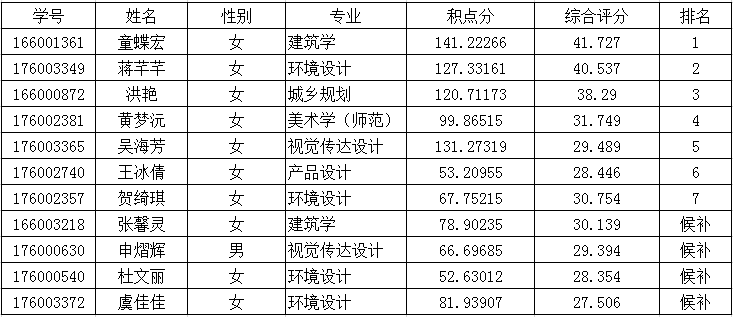 各位老师、同学: 根据《关于印发<亚洲情色 关于推荐接收免试攻读硕士学位研究生工作管理办法>的通知》(宁大政【2019】107号)文件精神,完成推荐接收免试攻读硕士学位研究生工作。根据学校下发的7个名额,按照各专业综合评分确定推荐顺序,1:1.5的比例在推免平台中予以推荐。现将2021年潘天寿建筑与艺术学院拟推荐免试攻读硕士学生名单公示如下: