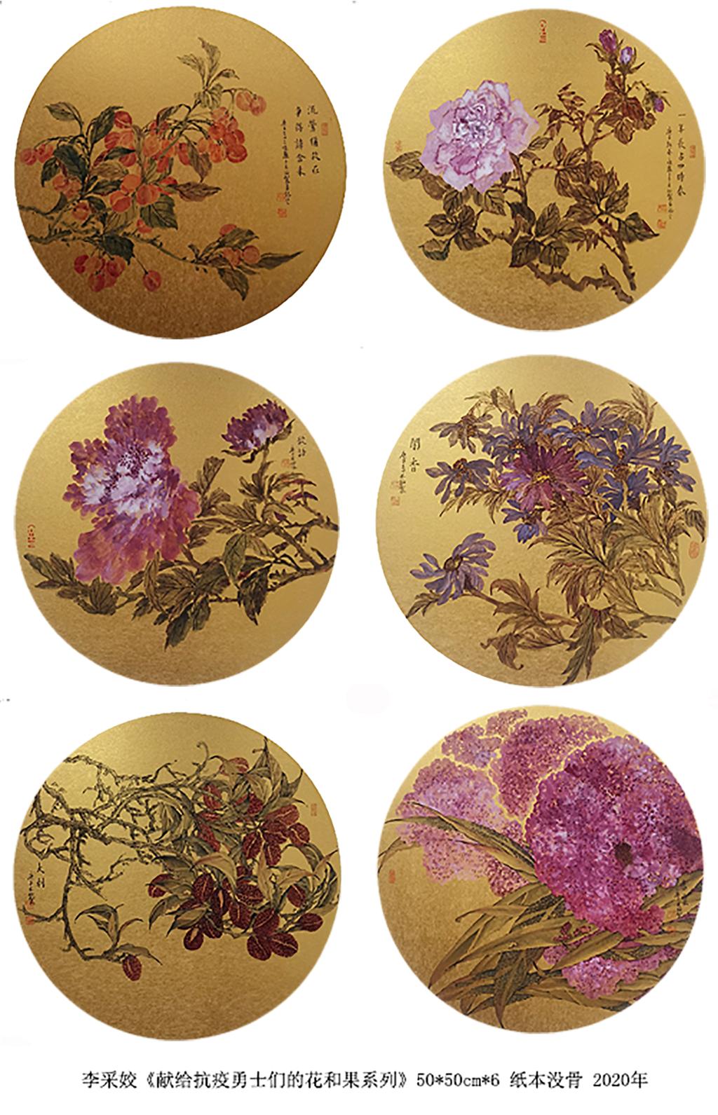该作品以物寓情,饱含深意。鸡冠花“鸡”同“吉”,蕴含着“永恒”、“进取”、“报恩”等意思。荔枝“荔”同“吉利”、“多利”之意,人们经常把裂开的荔枝作为“利势大开”的象征。樱桃中“樱”同“英”,意语“英雄、英勇”。菊花因其清寒傲雪,亦指人坚贞不屈的品格。月季和牡丹组合,则表现“富贵长春”之意,寄寓全国人民万众一心、战胜疫情,伟大祖国繁荣昌盛,人民安居乐业。提到创作原由,李采姣说,自己作为一名普通党员,始终牢记作为一名党员和文艺工作者的初心与使命,也积极响应习近平总书记的号召:文艺工作者一定要承担起社会责任,努力实现艺术性和社会性的有机结合。《献给抗疫勇士们的花和果系列》正是以文化自信为基石,以家国情怀为纽带,以民族精神为内涵,赋予其深厚的时代内涵,体现了文艺创作所追求的最高境界——真、善、美。李采姣进一步补充说,文艺作品作为时代最鲜活生动的载体,对一个民族和国家的文化质感、传播广度和传承深度有着深远的影响。李采姣希望在战“疫”时期,每位工作者更应树立起家国情怀,用仁爱之心去感悟世间的万物,用真挚之心去提炼事物的本质,用感恩之心去回馈社会的给予。