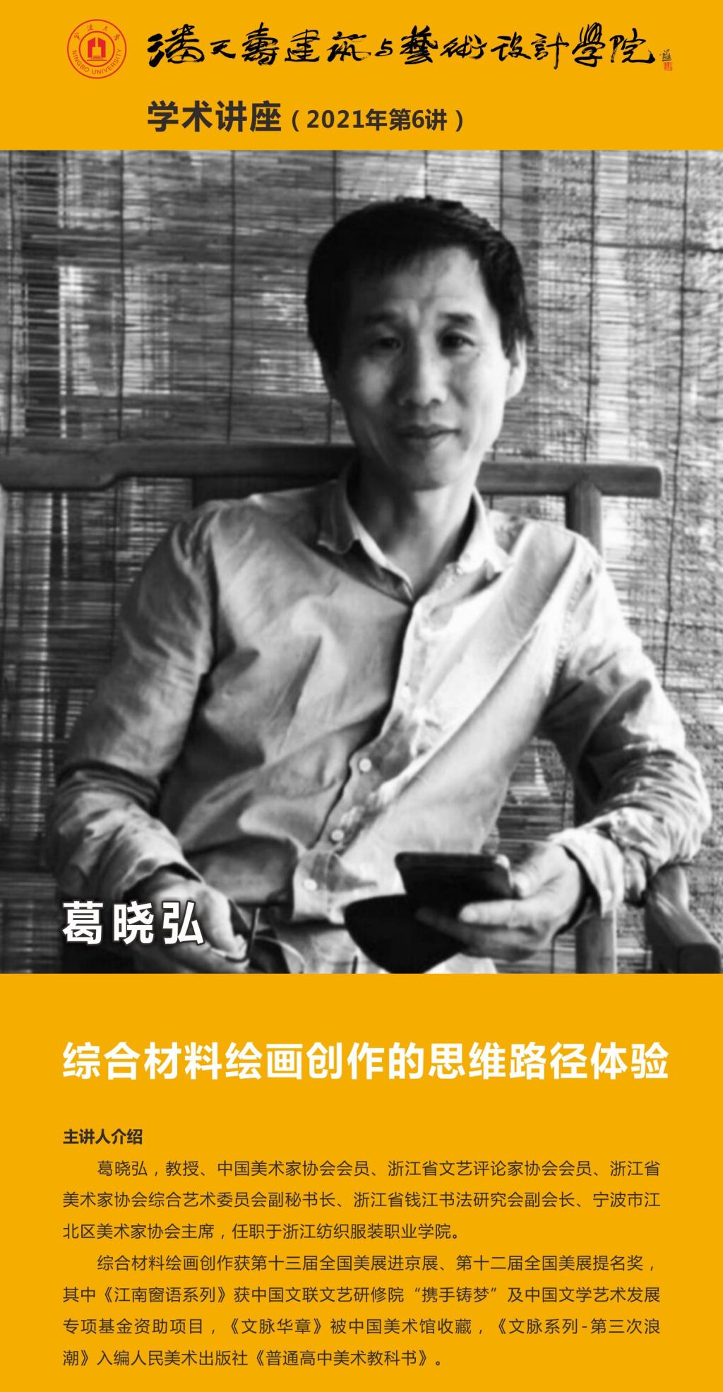 4月8日下午,宁波江北区美协主席葛晓弘教授应邀来我院进行学术讲座,和师生们分享了题为《综合材料绘画创作的思维路径体验》的丰富内容,并和师生们进行了互动交流。葛晓弘教授通过综合材料绘画的认识判断、创作思维的路径导向、艺术思维的取鉴和个人创作历程四个部分内容的精彩陈述,为大家展示了一位由国画转向综合材料绘画,并且取得骄人成果的优秀艺术家发展历程。葛晓弘学养丰厚,在艺术的形式和表达上着力颇深,近年来以二维码为主要表现形式的绘画创作集合了传统文脉、材料转化和个人艺术语言的时代递进,尤其是个人作品分析含括观念阐释、作品的媒材形成和艺术表达,语言生动切实,既有艺术家的率真,又不失研究者的沉思,给在场师生留下了深刻印象。交流环节中,葛教授为现场的师生答疑解惑,还为部分学生的毕业创作给予了中肯的指导。
