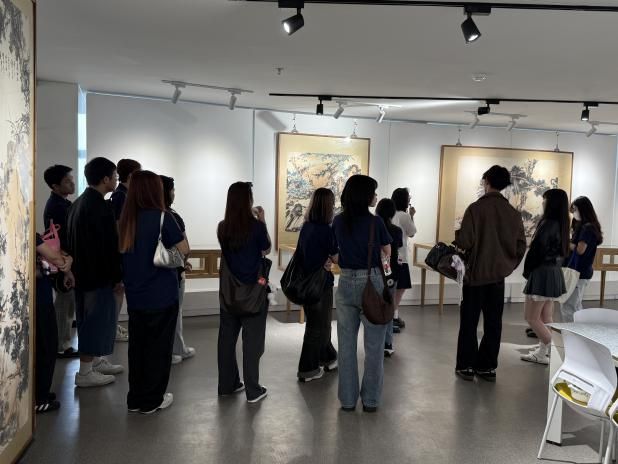 在风华叙美育宣讲团同学的讲解下,台湾师生走进思想馆,通过珍贵的历史文献、画作真迹等展品,深入了解潘天寿先生 认为“东西绘画是两座高峰” 的艺术理念以及他对中国画技艺的文化自信,感受传统艺术的深厚底蕴与独特魅力。在思想馆中,台湾师生们随着宣讲员的脚步不时驻足欣赏,对潘天寿先生的艺术成果赞叹不已。