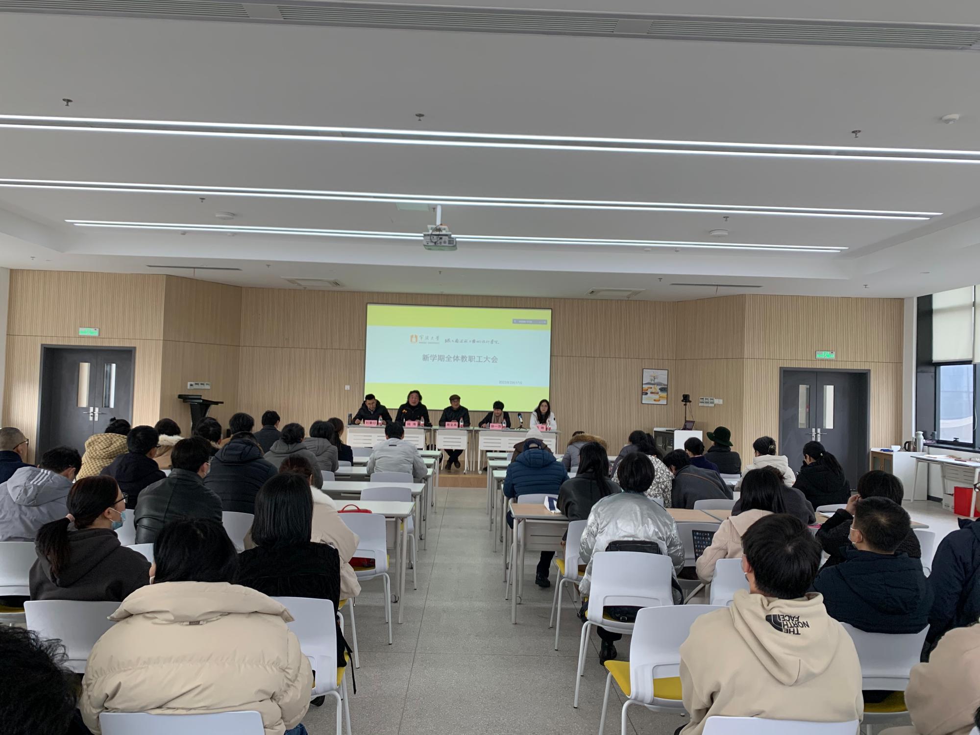 在黄庆苗黄陈月莉伉俪楼群教学楼213会议室召开新学期全体教职工大会,学院学术委员会主任周至禹教授、特聘院长徐仲偶教授、学院党政领导、全体教职工参加。会议由刘秉印副书记主持。