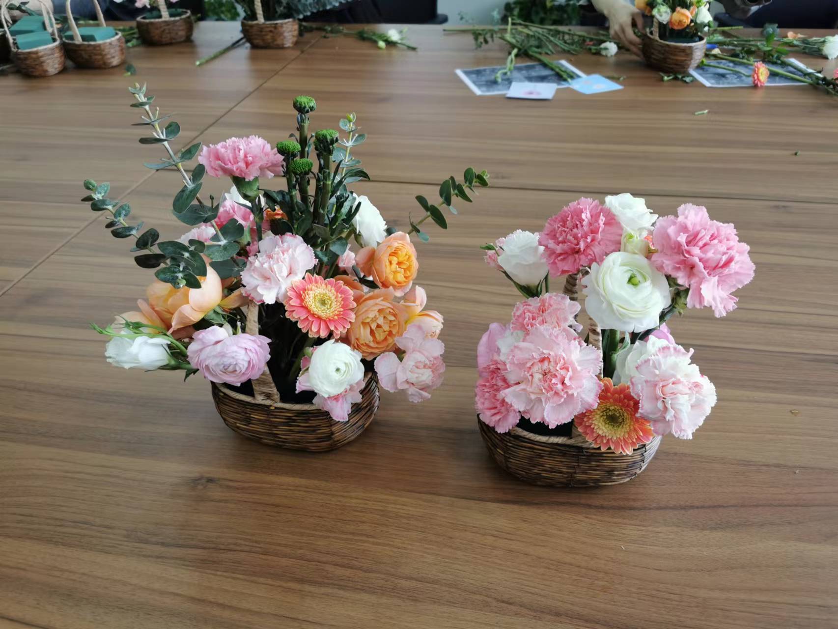 活动现场,特邀的花艺活动指导老师带领老师们共同感受插花艺术,从花卉蕴含的美好寓意、花材品类选择、色彩搭配等方面对插花注意事项、基本方法等进行现场讲解和演示。在插花老师指导下,学院老师们动手修剪、交流插花的技巧,很快用康乃馨、玫瑰、弗朗花、洋牡丹、小雏菊、尤加利叶等素材完成了诸多花艺作品。