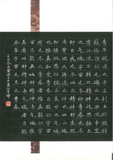 一等奖19级美术学师范1班卫紫茹同学的作品《节录青春》,内容节选自李大钊《青春》,文章歌颂了积极进取、乐观向上的革命精神,提出了“青春”的宇宙观和人生观。取法石门铭,追求率意天然,将文本内容中的豪迈、壮美之气象予以诠释,以意象的语言进行表达。