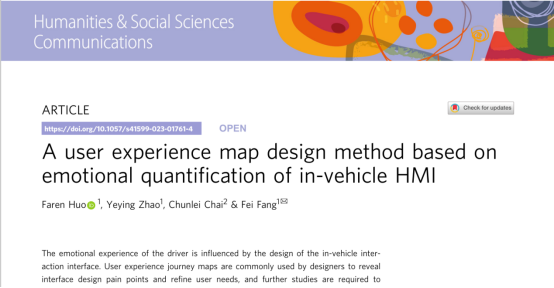 近日,我院特聘研究员霍发仁作为第一作者,方菲博士作为通讯作者,与2019级硕士研究生赵晔莹、浙江大学现代工业设计研究所副所长柴春雷教授合作撰写的学术论文“A user experience map design method based on emotional quantification of in-vehicle HMI”在《Humanities and Social Sciences Communications》上发表(论文链接://doi.org/10.1057/s41599-023-01761-4)。