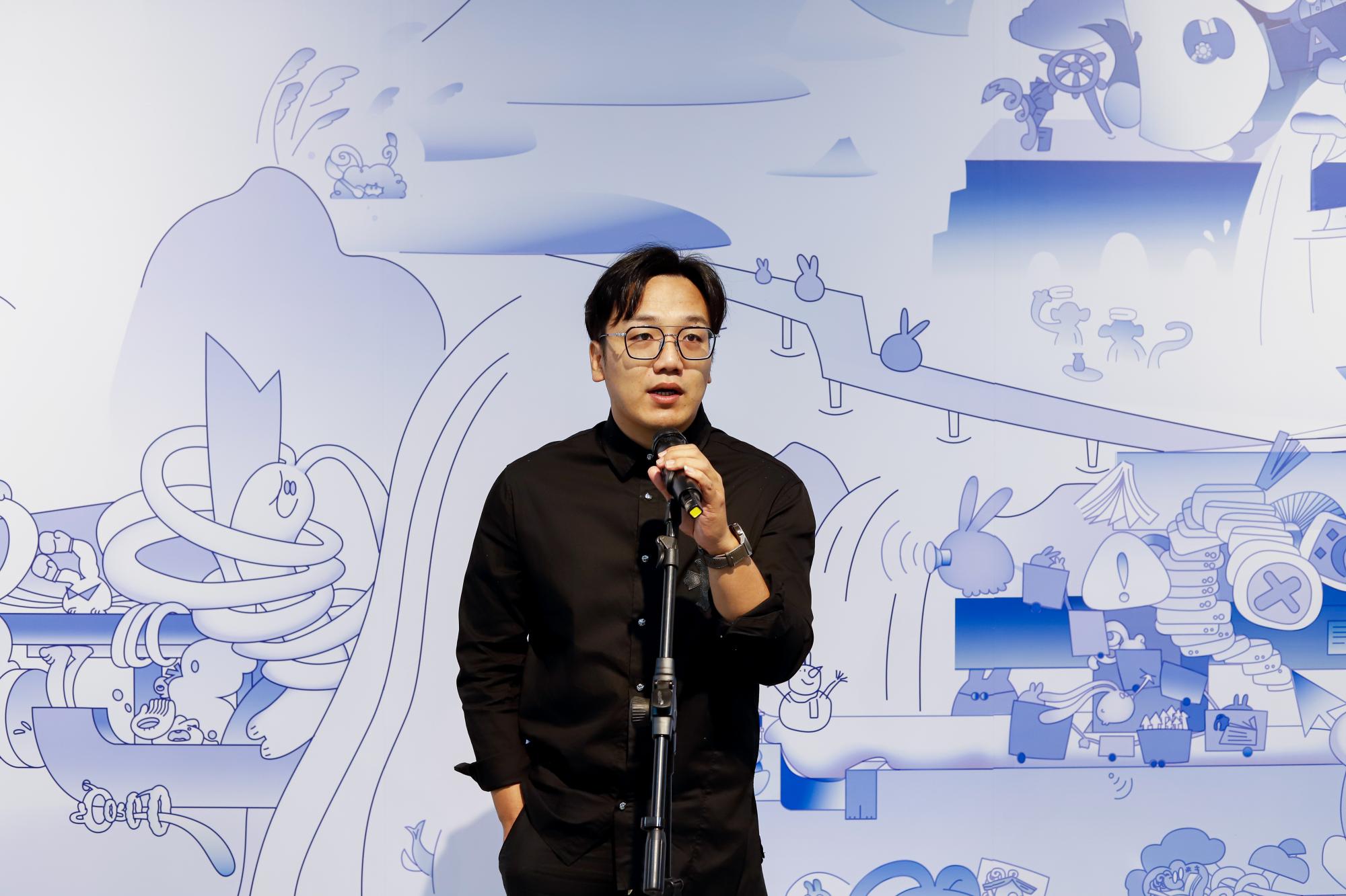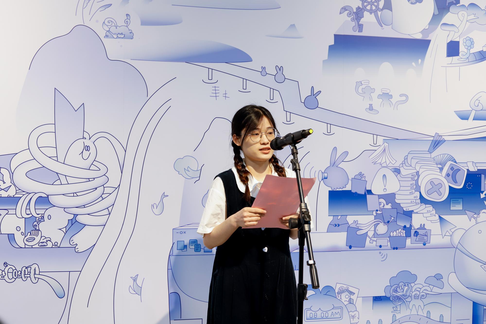 此次毕业展策展人邵良老师则简要介绍了此次策展落地的过程,并鼓励了同学们作为“未来的设计师”,要让作品学会说话,要创造出更具沉浸式体验的艺术作品,从而更好地走向市场,拥抱大众,真正做好艺术的传播工作。