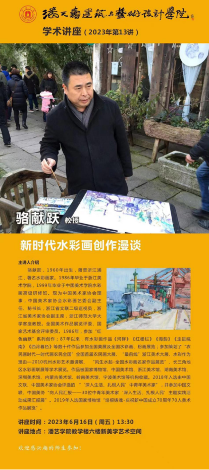 6月16日下午,我院美术系邀请中国美协水彩画艺委会副主任、秘书长、浙江省美协副主席骆献跃讲学,作了题为“全国美展获奖作品解析和新时代水彩画创作”的学术讲座,并和特聘院长徐仲偶教授及美术系部分教师进行学院专业提升方面的探讨。