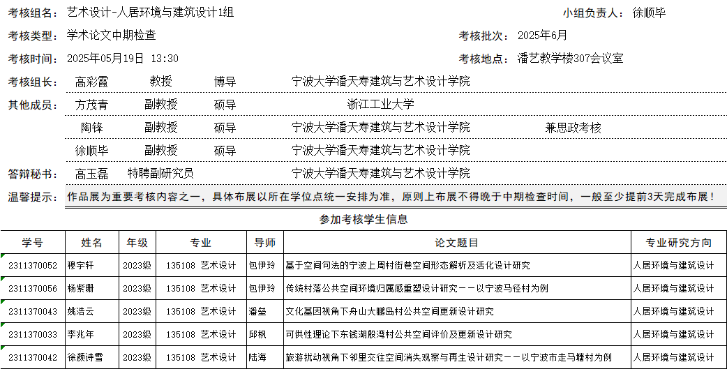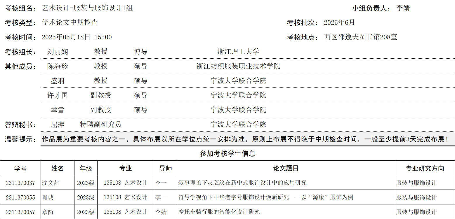 参加答辩学生须于2025年5月9日11点前完成《研究生培养工作工作日志本》、《研究生学位论文中期检查表》( 纸质材料及电子材料,内含决议表和答辩记录表)、投票表(1张汇总+7张投票表,信息填写完整),检查表按要求装订,材料统一由班长代收。