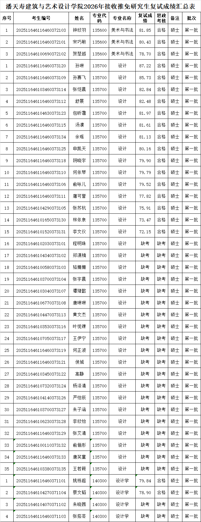 潘天寿建筑与亚洲情色 2026年接收推免研究生复试成绩汇总表(第一批)