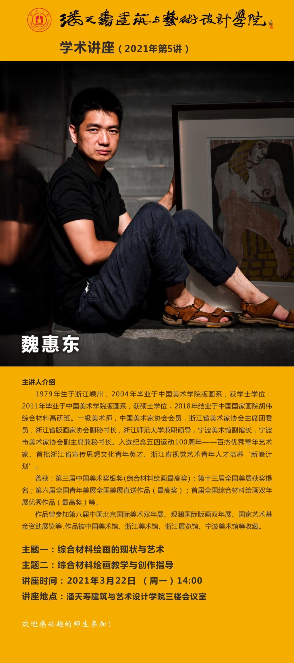 3月22日下午,宁波美术馆副馆长、一级美术师魏惠东应邀来我院进行学术交流,活动分为学术讲座和教学与创作指导两个主题。魏惠东不仅是当今我国综合材料绘画领域具有代表性的艺术家,而且在专业推广方面做了大量切实有效的工作,不断为推动宁波乃至全国综合材料绘画创作和研究发展而努力。魏惠东在讲座中分享了我国综合材料绘画的发展历程、国内外综合材料绘画不同时期具有代表性的艺术家作品,对宁波综合材料绘画创作和展览等相关内容经行了系统介绍,特别是在互动交流环节分享了他多年来系列作品的创作过程,为在场的师生提供了直接的艺术家案例。讲座活动结束后,部分师生陪同魏惠东一行到综合材料绘画教室,了解教学和课程并提出建议。