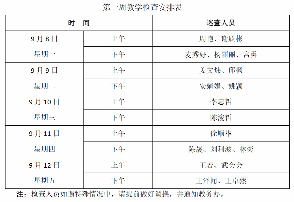三、检查要求:按照具体的检查方案,有计划、有步骤地认真落实。请各位负责检查的老师到教务办领取检查记录表(或自行打印),要做到每天按时检查,每天记录,检查结束后将教学检查情况登记表及时交给教务办,如检查无问题也需要将检查表签字交教务办留底。
