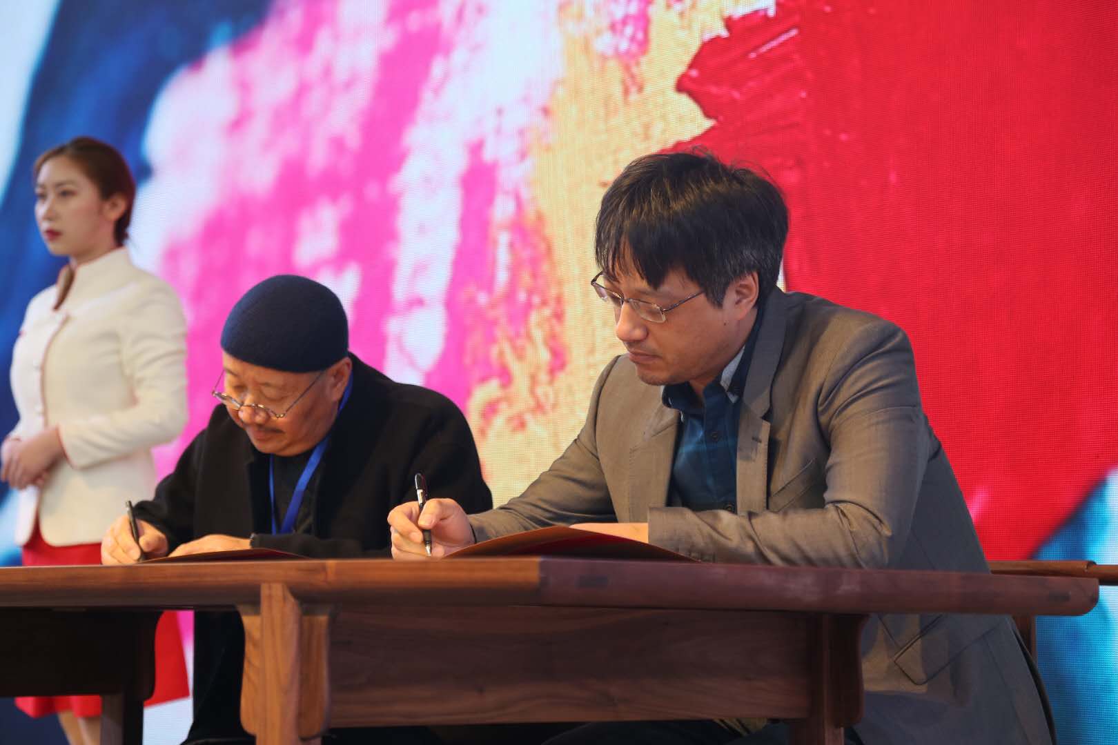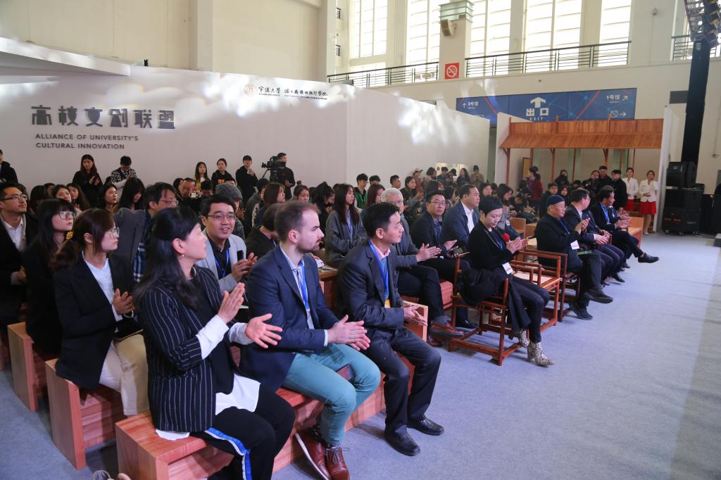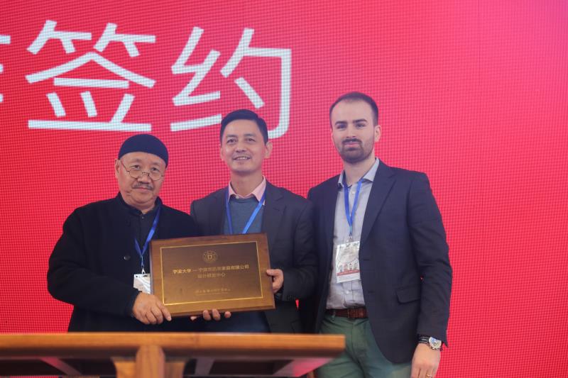 在校企合作签约仪式上,学院与宁波市华业纤维科技有限公司、宁波市凯荣家具有限公司、宁波咕咚创意科技有限公司等6家企业进行了签约和授牌。中央美院、中国美院、清华美院、浙大美院、浙江万里学院、浙江纺院等院校、相关合作企业、我校地方服务与合作处、科技学院、潘艺学院师生代表等200余人参加了高校文创联盟展暨论坛启动和校企合作签约仪式。