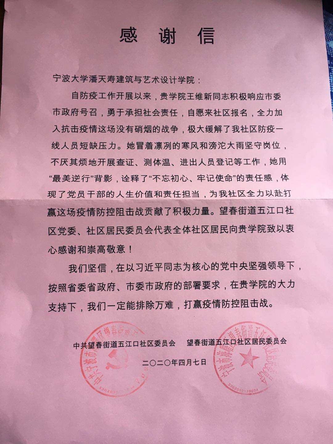 感谢信指出,王维新同志积极响应党和国家号召,勇于承担社会责任,自愿来社区报名,全力加入抗击疫情这场没有硝烟的战争,极大缓解了我社区防疫一线人员短缺压力。她坚守岗位,不厌其烦地开展查证、测体温、进出人员登记等工作,她用“最美逆行”背影,诠释了“不忘初心、牢记使命”的责任感,体现了党员干部的人生价值和责任担当,为五江口社区全力以赴打赢这场疫情防控阻击战贡献了积极力量。