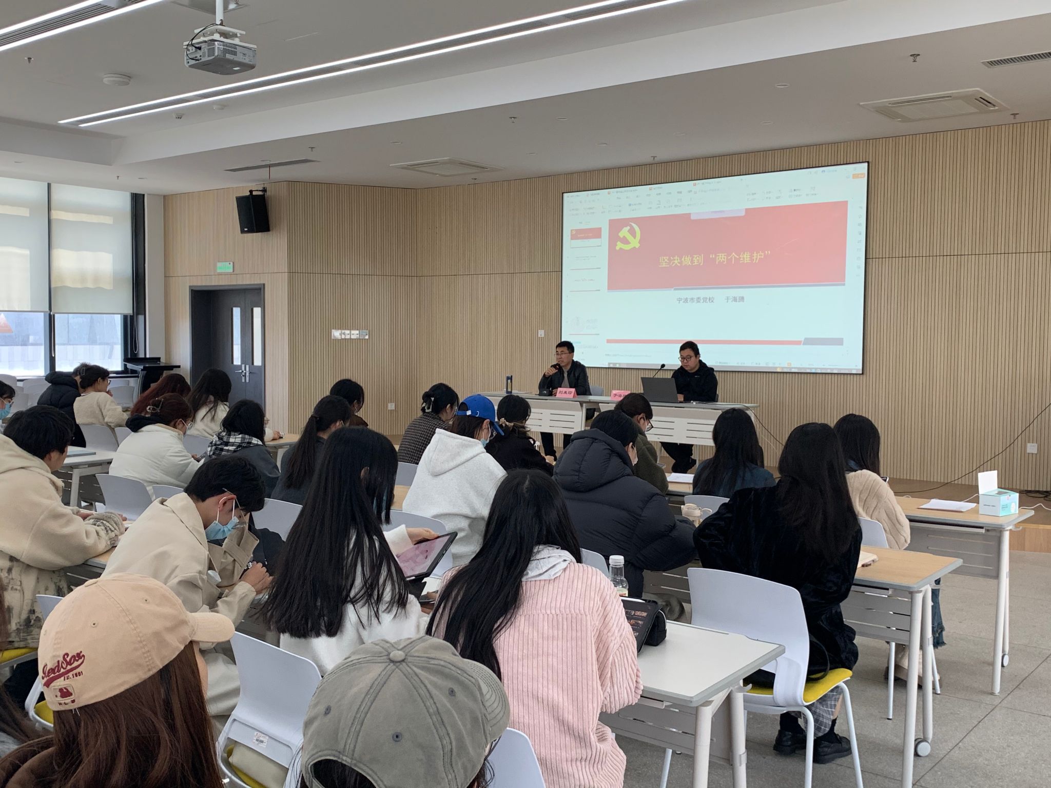 会议邀请了中共宁波市委党校于海腾老师, 于老师以《坚决做到“两个维护”》为主题,为与会学生上了一堂生动党课。于老师指出,对党忠诚,是共产党人首要的政治品质,其核心要求就是要做到“两个维护”。青年大学生是国家的希望、民族的未来,要坚定做“两个维护”的拥护者和实践者。于老师从人民组织起来,需要核心;历史证明,核心发挥了重要作用;核心在实践中成就、在实践中证明等三个方面阐述了维护党中央权威和维护习近平总书记核心地位的重要性。