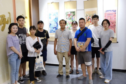 随后,在村民的引路之下,师生们来到了农民画画家郑根良老师之家,他讲述了他与农民画的经历和故事,他说道,他从小深受精通琴棋书画的母亲影响,即使从未正统学过绘画,但一直对绘画有很大的热情,年过古稀的他至今仍两三天画一副农民画。在郑老师的带领下,师生们参观了他的画室,学习到了农民画的有关知识,并感受到了农民画对村民精神层面和生活方式影响。在他的画室,墙上陈列的农民画已摆放不下,郑老师对农民画的热情和坚持学习的态度值得新时代大学生学习。