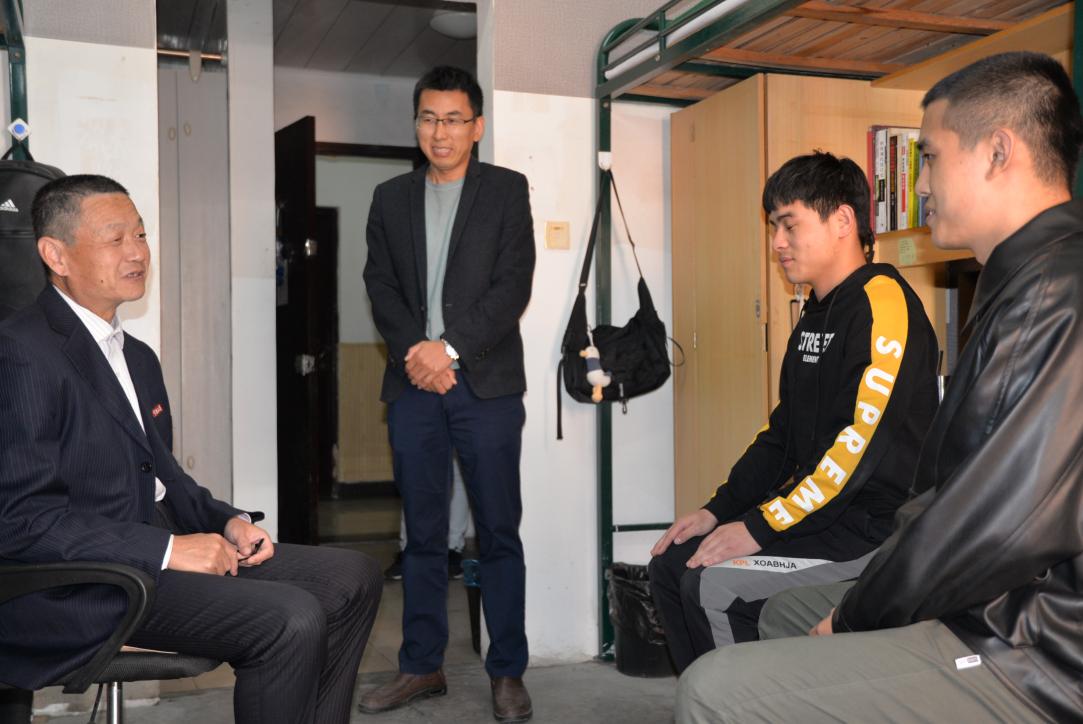 冯书记来到西校区公寓1号楼308寝室,与寝室退伍返校的两位同学亲切交流,关切地询问了他们退伍返校后是否能适应大学生活,仔细地了解他们目前的学习生活情况。当得知同学有志于考研时,冯书记结合自身的成长经历,强调了继续深造的重要性,也希望同学们能通过备战考研,感染更多宁大学子加入考研队伍,进一步提升自身综合实力。同时,冯书记也希望同学们能够养成良好的运动习惯,培养一项体育爱好,并成为一生的兴趣长期坚持,真正做到“每天锻炼一小时,健康工作五十年,幸福生活一辈子”。