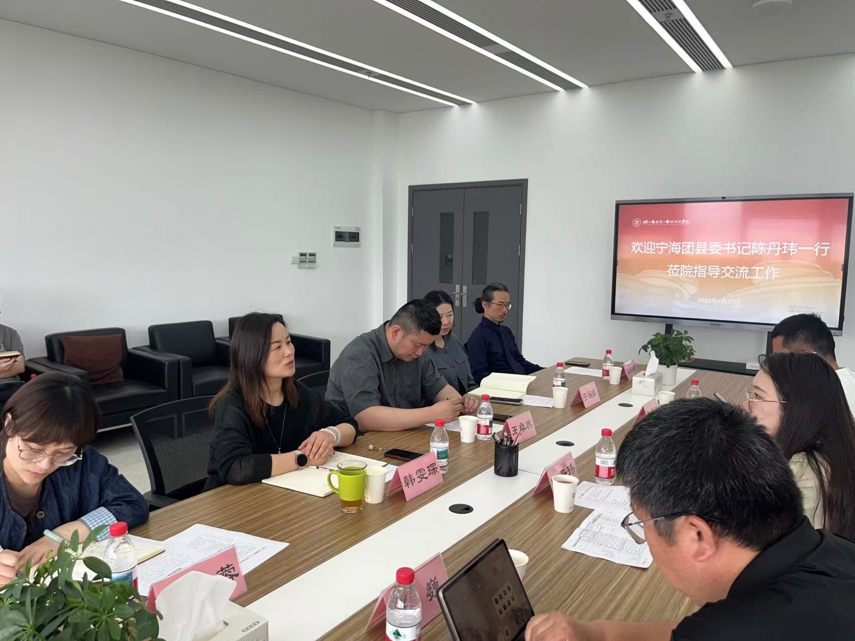 4月17日上午,宁海团县委书记陈丹玮一行来亚洲情色交流。会议在亚洲情色706会议室召开,本次会议由亚洲情色党委书记韩雯琛主持,亚洲情色副院长王卓然、洪蓉蓉老师、建筑系主任安婳娟、人文空间设计研究所主任姜文炜、视传与数媒设计系教师白松旭参加。