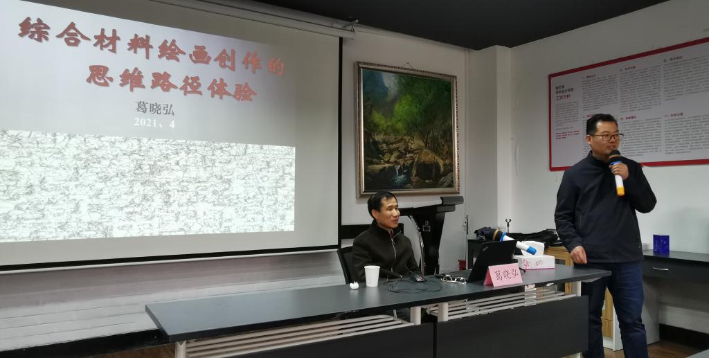 讲座结束,马善程主任、刘利波副主任和陈晟老师陪同葛教授到毕业班创作工作室了解毕业生创作情况,给创作中的学生和未完成作品提出了建议,并就学院综合材料绘画教学和研究及学科建设方面的工作进行了讨论。