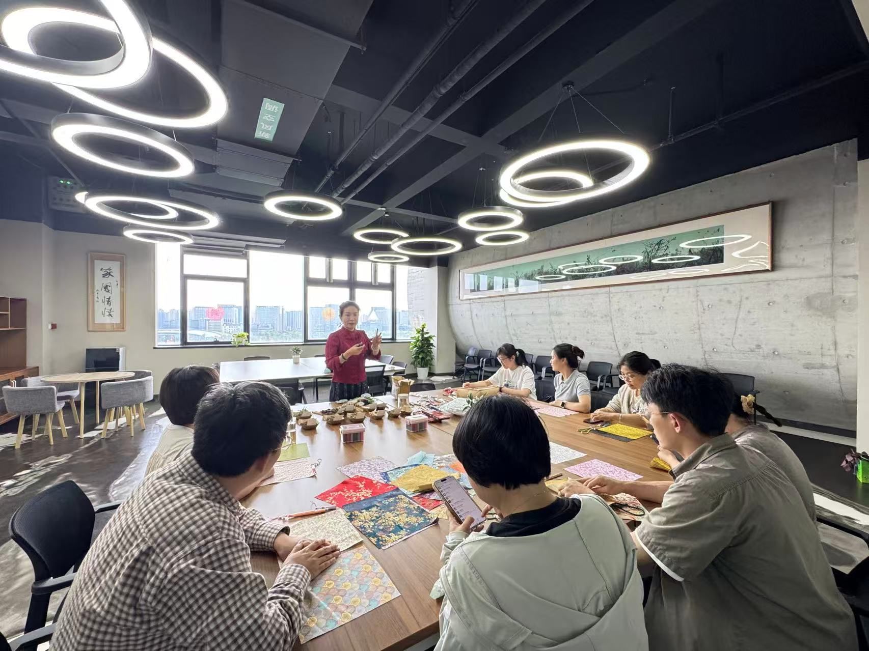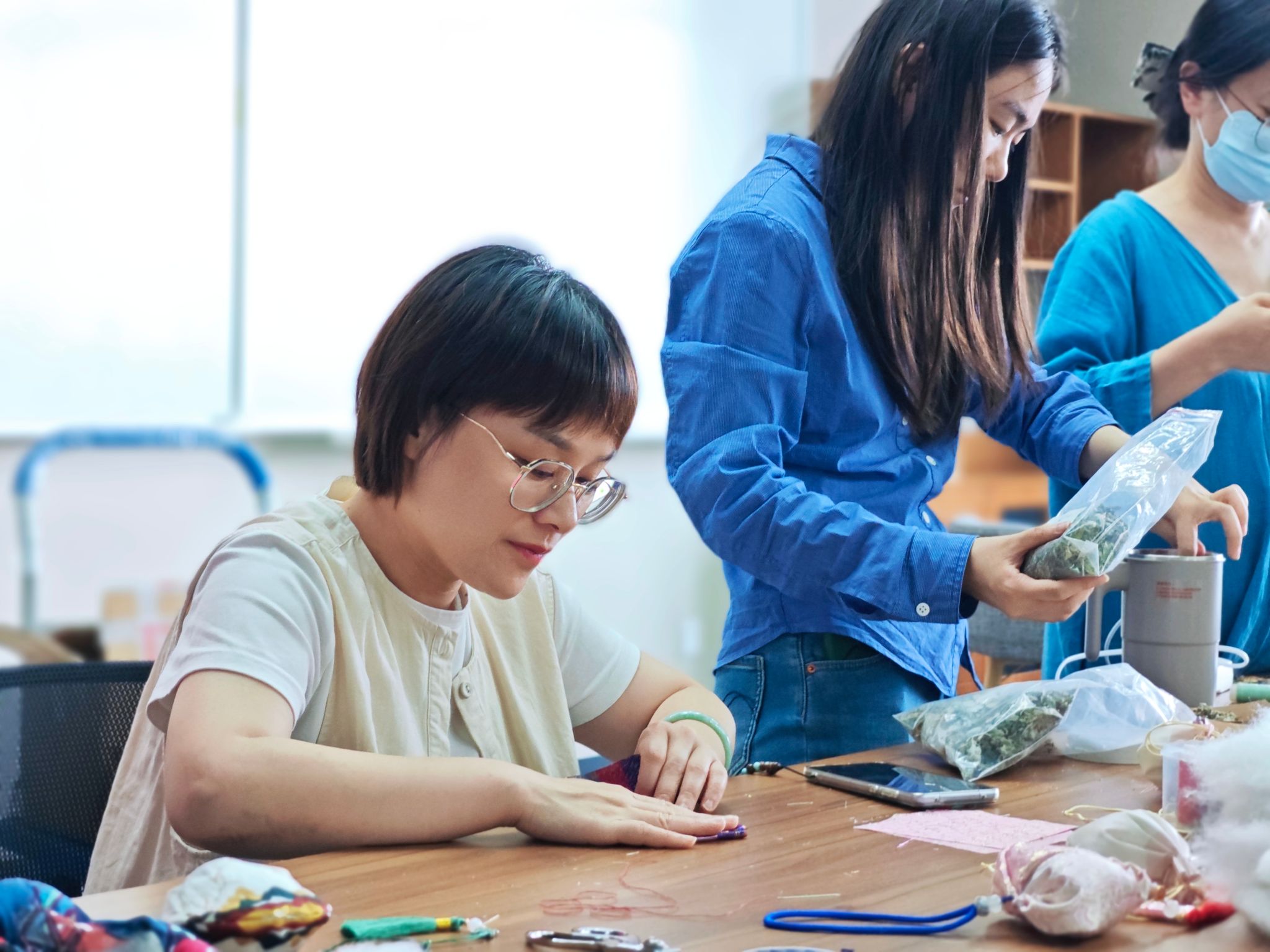 讲解结束后,活动进入实操环节。桌上早已备齐各色绸缎布料、五彩丝线、绣花针、棉花等,色彩斑斓的材料瞬间点燃了大家的创作热情。教职工们在焦老师的指导下,从穿针引线开始,一步步学习缝制囊体、填充香料、收口塑形、点缀流苏,现场气氛热烈而温馨,欢笑声与穿针声交织成一片。活动尾声,教职工们互相展示着自己的“作品”,将香囊系在包上、挂在椅背上,或是作为礼物送给同事、家人。小小的香囊,承载着对健康平安的祈愿,更串起了工会大家庭的温暖联结。