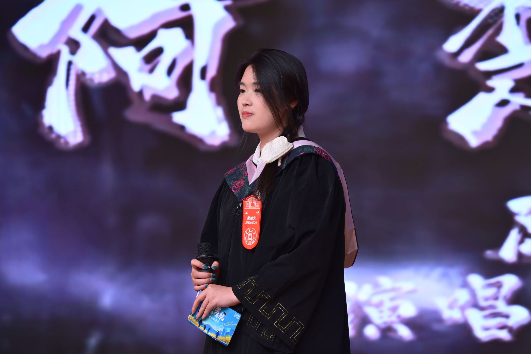 师生代表依次发言。本科生毕业生薛鑫雨同学在发言中回忆了求学点滴,她说:“真正的毕业不是离开,而是带着潘艺的烙印,去更远的地方发光”。真挚动人的感言,深深叩击着在场每一位毕业生的心弦。