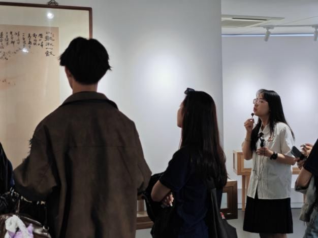 在风华叙美育宣讲团同学的讲解下,台湾师生走进思想馆,通过珍贵的历史文献、画作真迹等展品,深入了解潘天寿先生 认为“东西绘画是两座高峰” 的艺术理念以及他对中国画技艺的文化自信,感受传统艺术的深厚底蕴与独特魅力。在思想馆中,台湾师生们随着宣讲员的脚步不时驻足欣赏,对潘天寿先生的艺术成果赞叹不已。