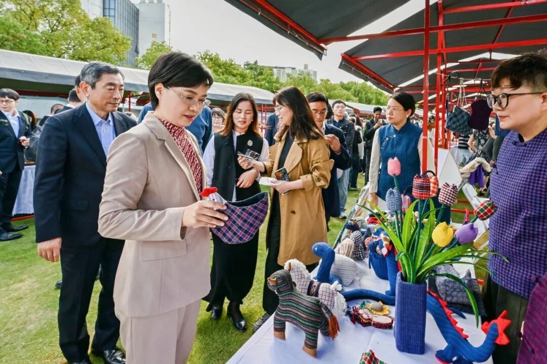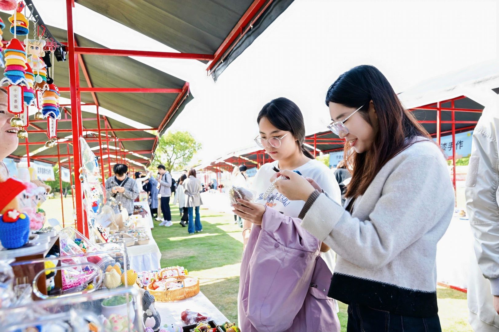 近百个匠心摊位如秋叶绚烂铺展,师生作品竞相绽放,篆刻、漆艺、书法等这些平日里在课堂上的作品都被搬到了大草坪。余姚土布、河姆渡大漆、宋锦流光、植物染衣、绳艺编织这些传统手艺,加上师生的设计,呈现传统与现代的碰撞之美。更有“强国行”党建联建项目 “横坎头村土特产”“潘火街道守弄筑梦文创产品”走进市集,诠释“设计就是生产力”。“宁大创咖”等校内创业团队,在市集里同样展现出了宁大学子的创新创业基因......