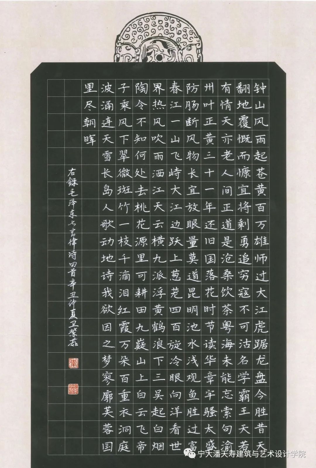 参赛作品辑选书写的为毛泽东同志的七言律诗四首,分别是《七律·人民解放军占领南京》、《七律·和柳亚子先生》、《七律·登庐山》、《七律·答友人》等诗篇,诗作展现并重温了中国共产党带领全国人民,坚持将革命进行到底,夺取全国胜利,乐观旷达的革命主义精神,以及为中国人民谋幸福,为中华民族谋复兴高度负责的历史责任和使命感。