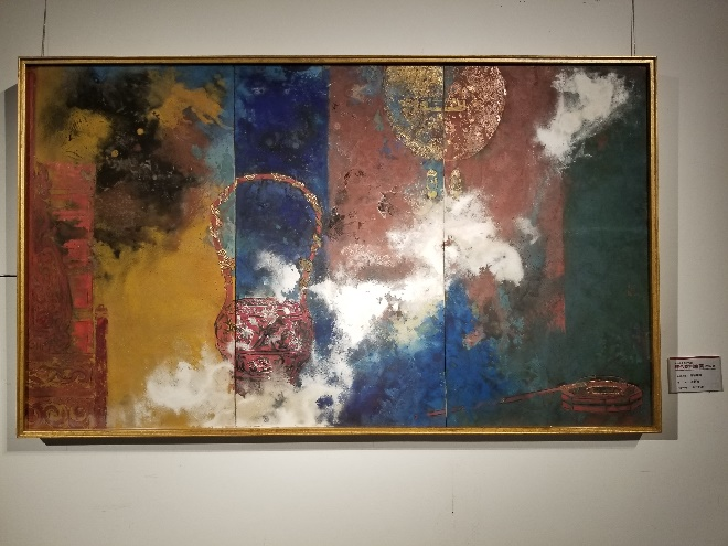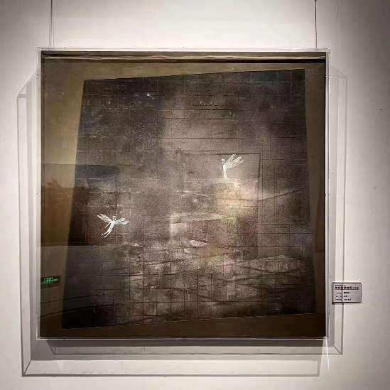 陈晟老师的作品《云销雨霁》基于山水题材,通过水性材料和油性材料的综合应用,结合肌理制作和拼贴技法,表现出山峦重叠中雨后初晴的意象和生态中国之美。李琼老师的作品《时代·刻痕》通过将旧报纸打碎成纸浆,塑造出青石碑上的APP图标、软件名、计算机语言(源代码)“0”“1”和人工智能缩写“AI”等形象,来表达人类文字语言与传播方式的改变的思考。刘利波老师作品的《红妆印象》取材十里红妆的宁波当地婚嫁风俗,通过传统的材料和沥粉贴金、泼洒等表现手法把嫁妆进行颇有特色的呈现,在色彩应用和物象组合方面体现出中国国画创新的美学诉求。石羡老师作品《蜻蜓房子》借助构建的楼房、屋子、车辆、方舱等格子活动空间,映衬出蜻蜓人不受传统图示羁绊,积极向上、自由飞翔的形象。四位老师的作品扎根并关注丰富多彩、日新月异的时代生活,很好坚持了以人民为中心的创作导向,创新了综合材料绘画的材料、技法的多样展现形态。