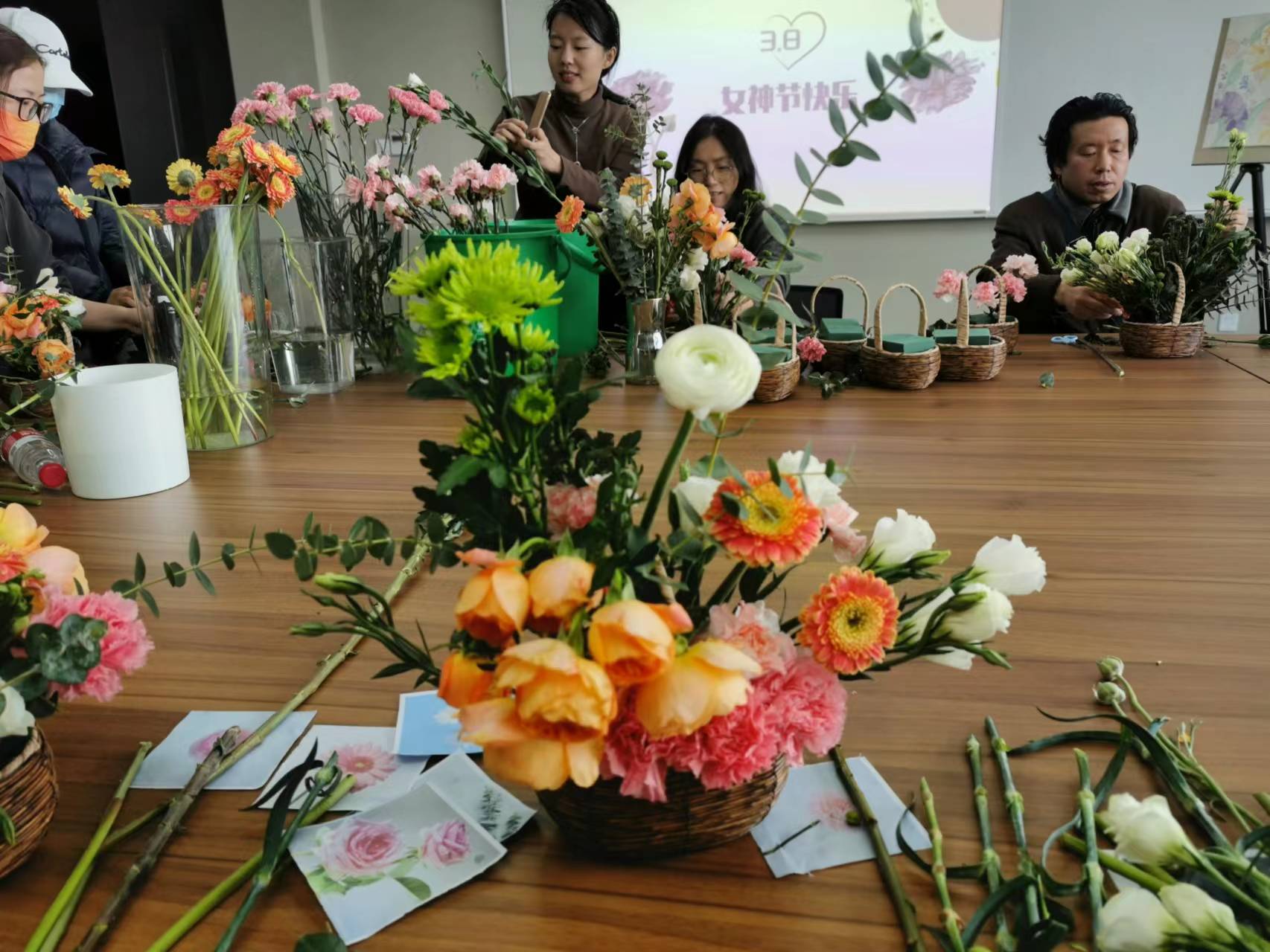 活动现场,特邀的花艺活动指导老师带领老师们共同感受插花艺术,从花卉蕴含的美好寓意、花材品类选择、色彩搭配等方面对插花注意事项、基本方法等进行现场讲解和演示。在插花老师指导下,学院老师们动手修剪、交流插花的技巧,很快用康乃馨、玫瑰、弗朗花、洋牡丹、小雏菊、尤加利叶等素材完成了诸多花艺作品。
