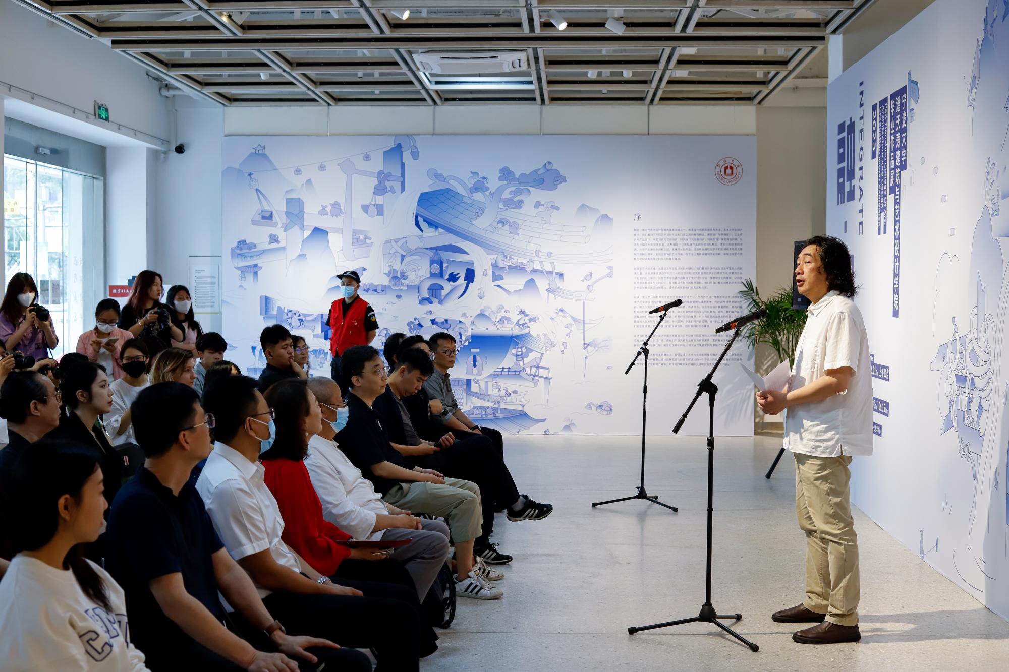 执行院长陆海作开场发言。陆海院长解释了此次展览“融·叙”的主题:“融合”是当代艺术设计发展的重要主题之一,在此次毕业设计展中,学院不同艺术设计专业和门类之间的有机融合,从而产生出许多新颖生动、意味深长的作品;同时,“叙事”也是这次毕业设计展的关键词,此次展出的设计作品展现了学生们对生活、情感和文化的理解。