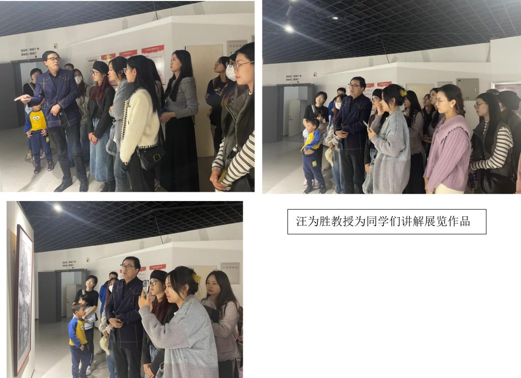 研讨会后,汪为胜教授单独为我院师生讲解了本次展览的展品,用直观的画面与作品让同学们深入感受新传统,体会不同技法产生不同的艺术面貌及其在实际中的运用。汪教授还分析了画面中造型、线条、黑白灰关系、质感、水墨干湿等具体画面构成成分的应用,强调在创新过程中也要重视中国画基本功的练习与对传统的继承,对同学们日后的创作提出路径指导,同学们纷纷表示在本次展览中收获良多。