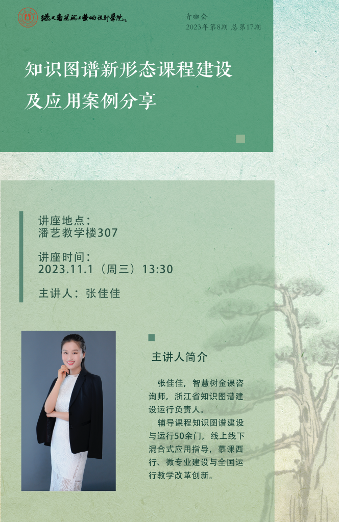 第17期“青咖会·教学交流活动”在潘艺大楼教学楼307顺利举行。本期交流会邀请智慧树金课咨询师、浙江省知识图谱建设运行负责人张佳佳进行知识图谱新形态课程建设及应用案例分享。分享会由教学副院长周艳主持,学院十余位教师参与此次交流活动。