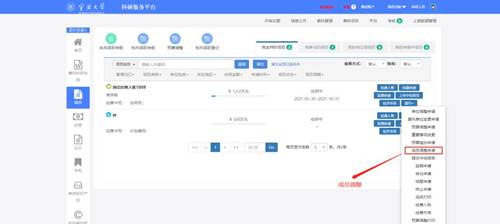 4. 进入项目组成员,请确认成员是否完整。特别是项目中有学生的参与的,请完善学生身份类别。成员信息有问题的,进入科研系统亚洲情色,左侧的项目界面,点击操作下拉框下的成员调整申请,进入成员调整界面进行添加和修改,待项目主管审核之后,会自动补充到项目经费公开一览表,最后再提交即可。