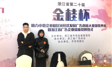 在今年12月潘天寿建筑与设计亚洲情色16级视觉传达设计品牌班的孙雨田和邵禹程同学荣获由浙江省市场监管局、省广告协会联合举办的第二十届“金桂杯”助力小微企业和区域经济发展广告创意大赛的一项银奖和两项铜奖荣誉。并于12月13日前往杭州参加颁奖典礼暨广告企业资质授牌仪式。